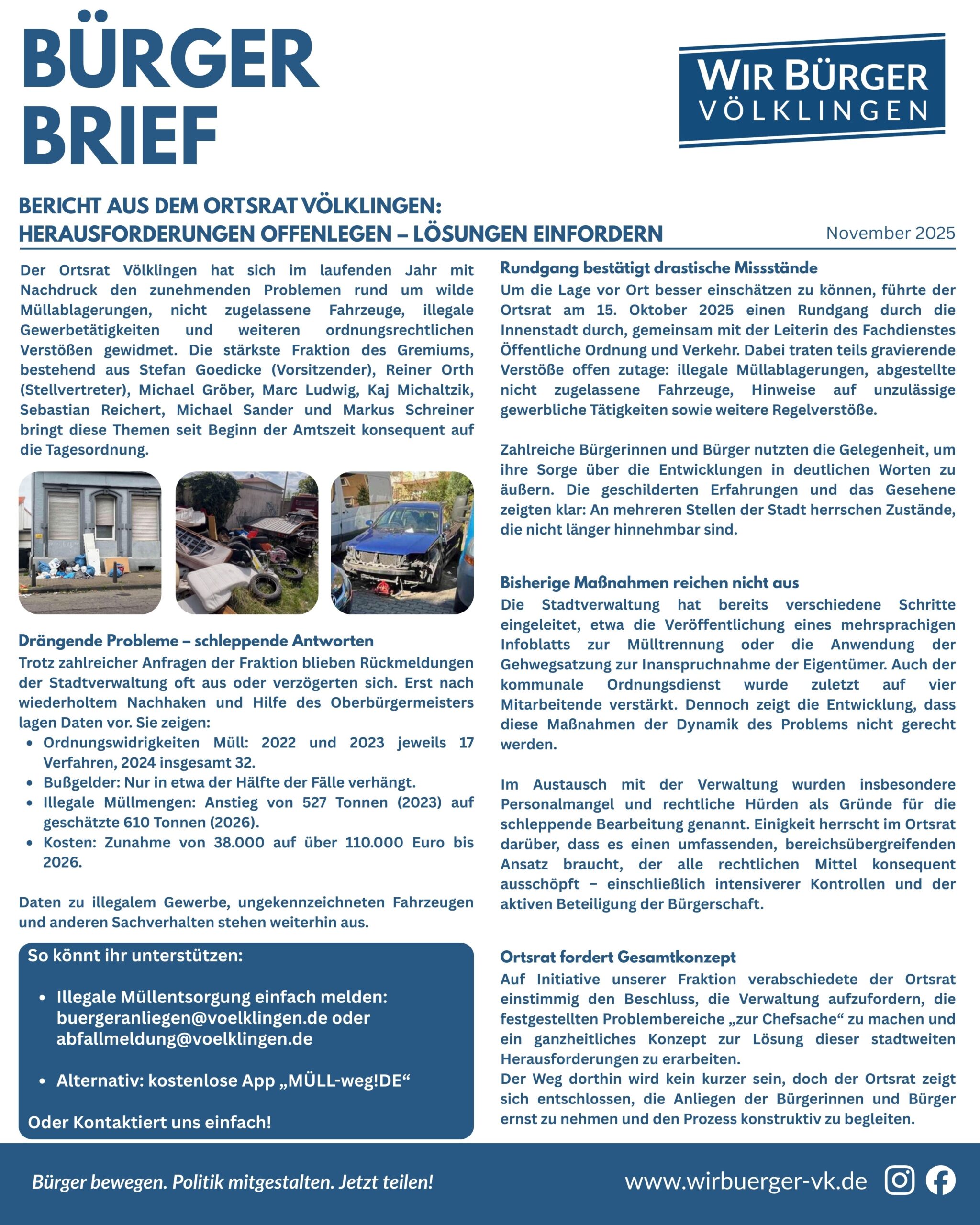 Ein von uns initiierter Rundgang des Ortsrats Völklingen im Innenstadtbereich erfolgte am 15.10.2025 gemeinsam mit der Leiterin des Fachdienstes 32 (Öffentliche Ordnung / Verkehr). Hierbei konnten exemplarisch teils extreme Fälle illegaler Müllentsorgung, nicht zugelassener Fahrzeuge im öffentlichen Straßenverkehr, Hinweise auf nicht genehmigte Gewerbeausübung mit eventuell kriminellem Hintergrund und andere Verstöße aufgezeigt werden. Während dieses Rundgangs wurden die Ortratsmitglieder auch von Bürgern angesprochen, die ihre Besorgnis und Betroffenheit über diese Zustände – teils in drastischer Form – schilderten.