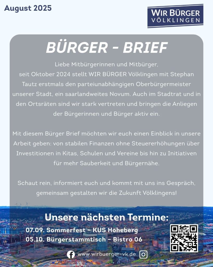 Wenn wir die Bedürfnisse unserer Bürger in den Mittelpunkt stellen, werden wir in der Lage sein, unsere Stadt an vielen Fronten zu verbessern. Unser Ziel ist eine nachhaltige und funktionierende Stadt. Wir laden Sie herzlich ein, sich aktiv an der Gestaltung unserer Stadt zu beteiligen. Gemeinsam können wir viel bewegen und Völklingen zu einem noch lebenswerteren Ort machen.
